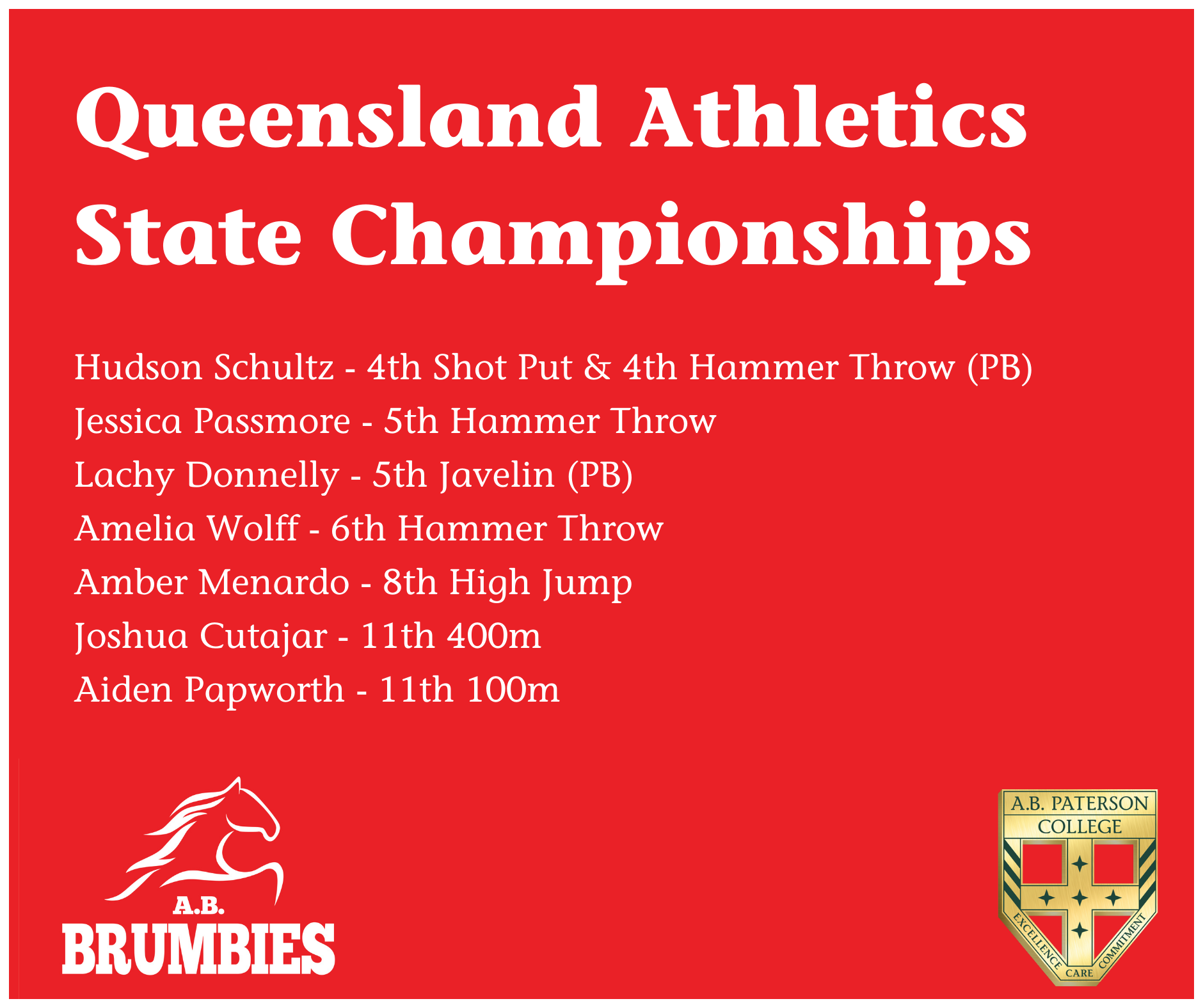 Twelve of our A.B. Brumby athletes participated in the State Athletics Championships over the weekend, and what a success!