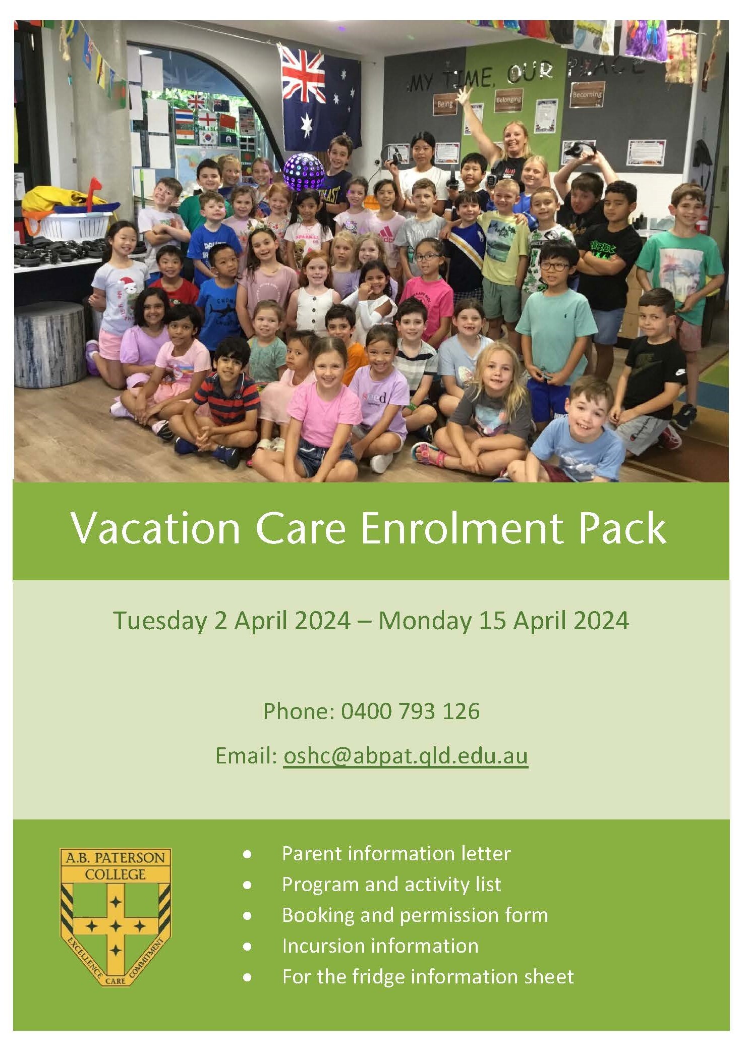 The Vacation Care Enrolment Pack includes: